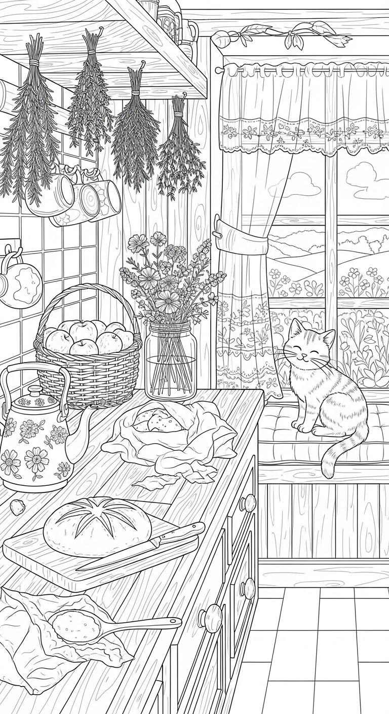 Hier kannst du Ausmalbild Gemütliche Rustikale Küche (Cottagecore) direkt herunterladen. 📥 KOSTENLOS HERUNTERLADEN (PDF)